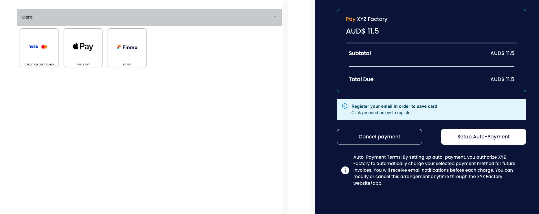 When your customers open the URL, they will be able to set up auto payments with their preferred payment method.