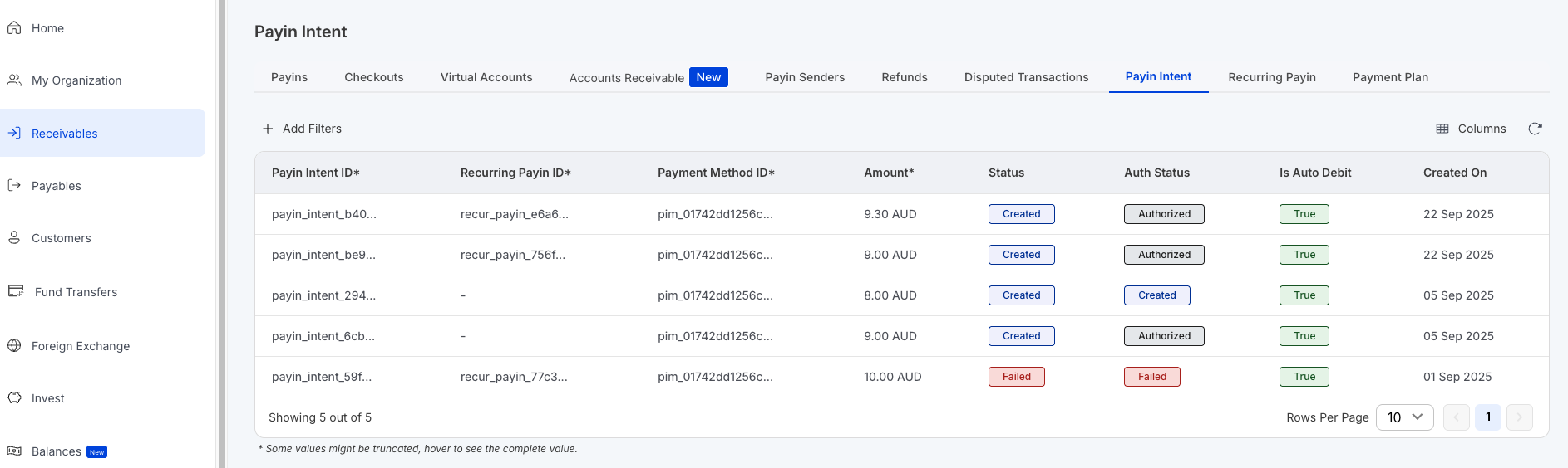 To view all the payin intents, navigate to Receivables → Payin Intents
