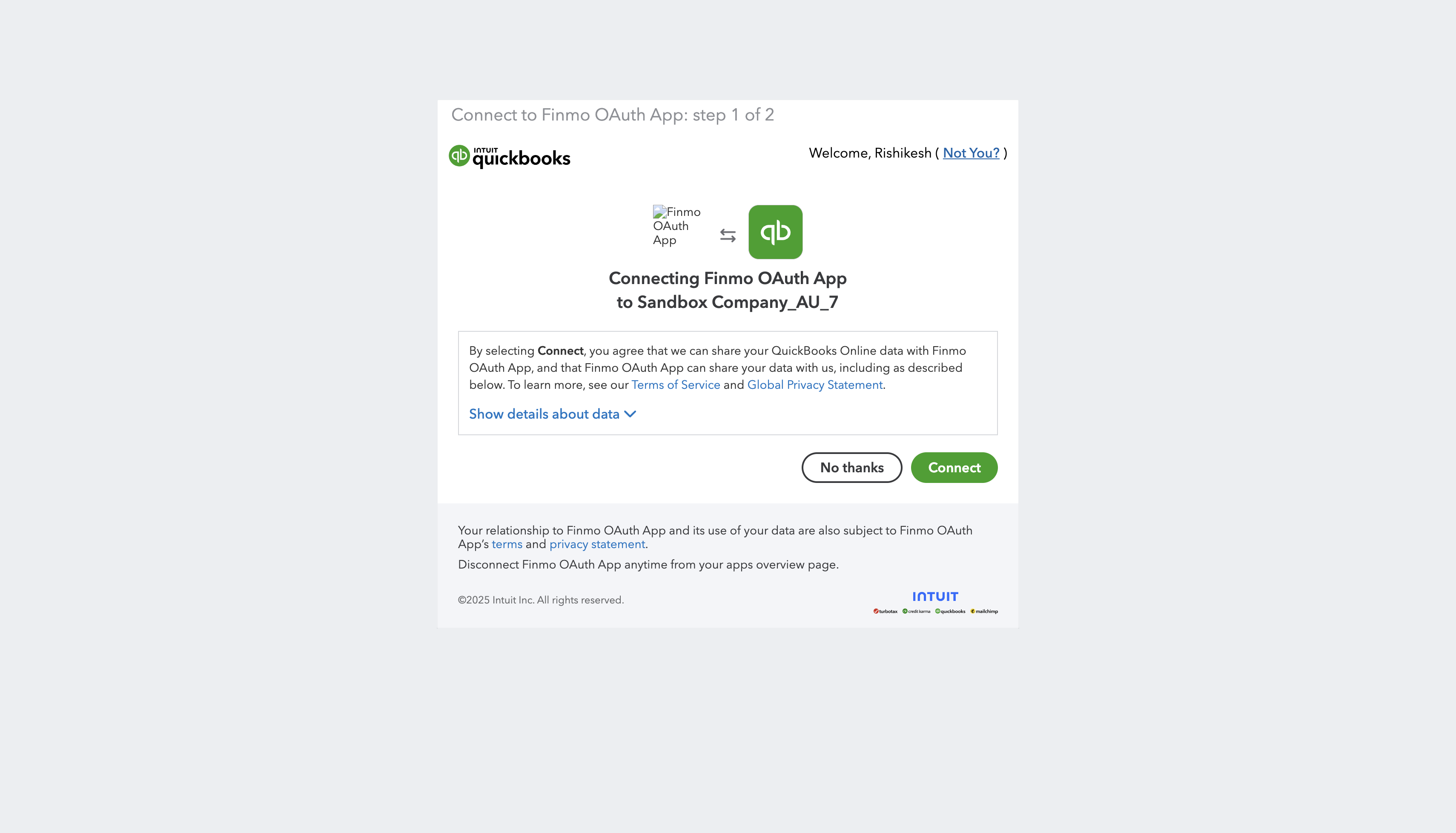 - Click Connect on the QuickBooks card to open the QuickBooks authorization page. Select the organization you want to link to Finmo and grant the required access. Once approved, a secure connection will be established between your Finmo and QuickBooks accounts.