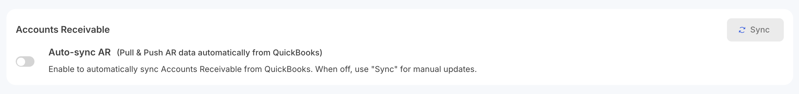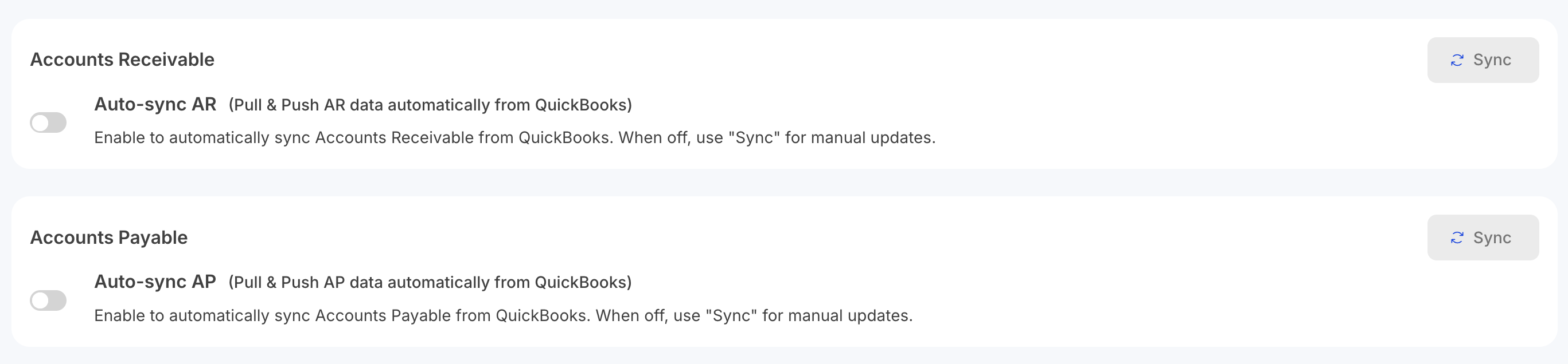 - AR and AP created in Quickbooks can be pulled into Finmo with a single click. In the Quickbooks Configuration section, you can enable Auto Sync to automatically pull AR and AP records from Quickbooks, or use the Sync button to pull them on an ad-hoc basis.