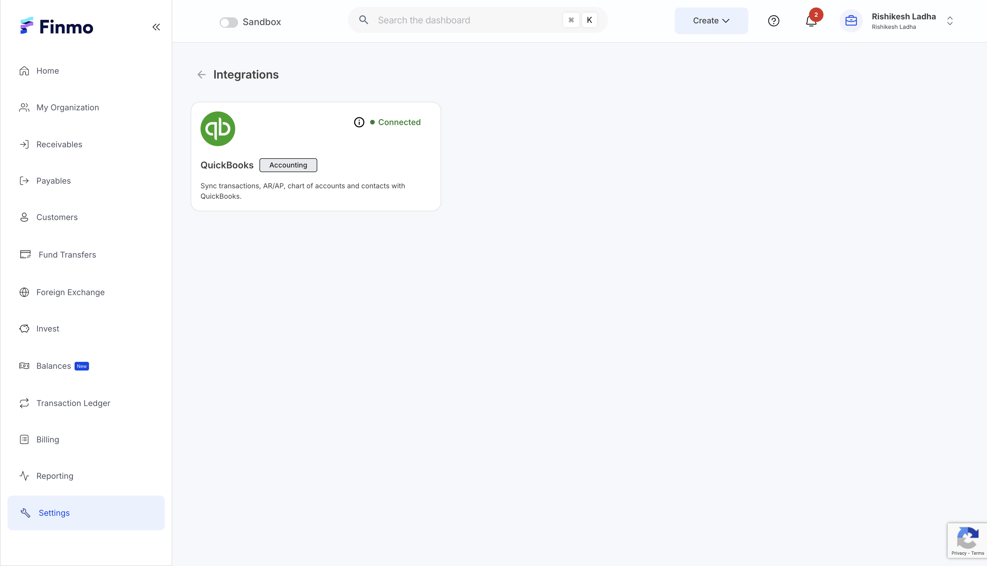 Enabling the Quickbooks integration for your organization allows seamless synchronization between Finmo and Quickbooks.