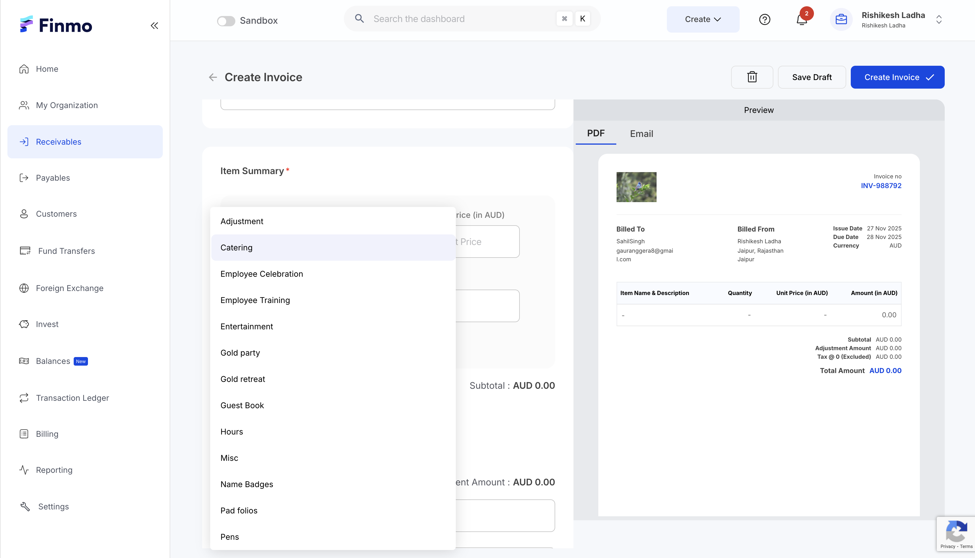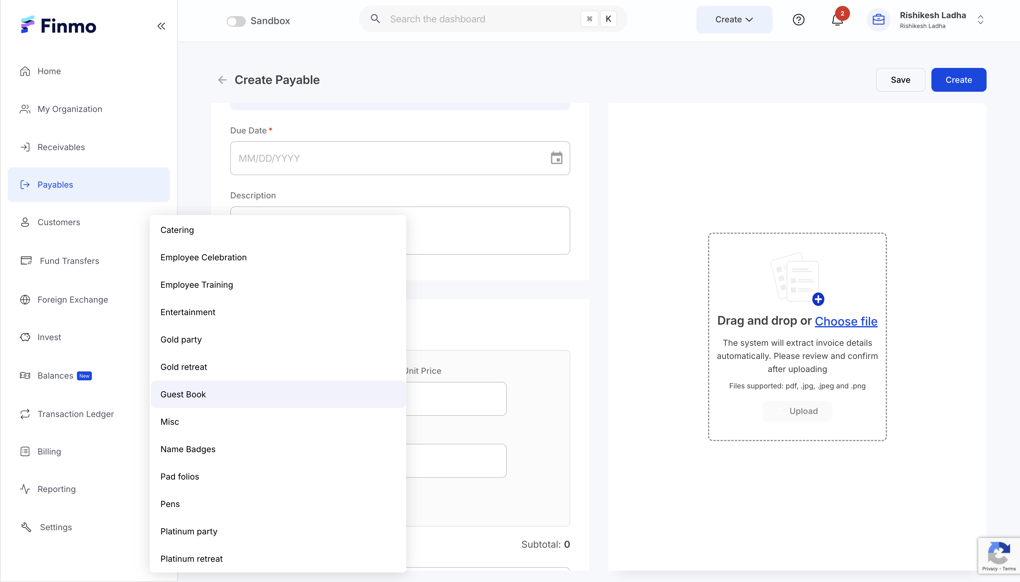 - After completing the configuration setup, you can proceed to create AR or AP entries from the Finmo Client Portal.