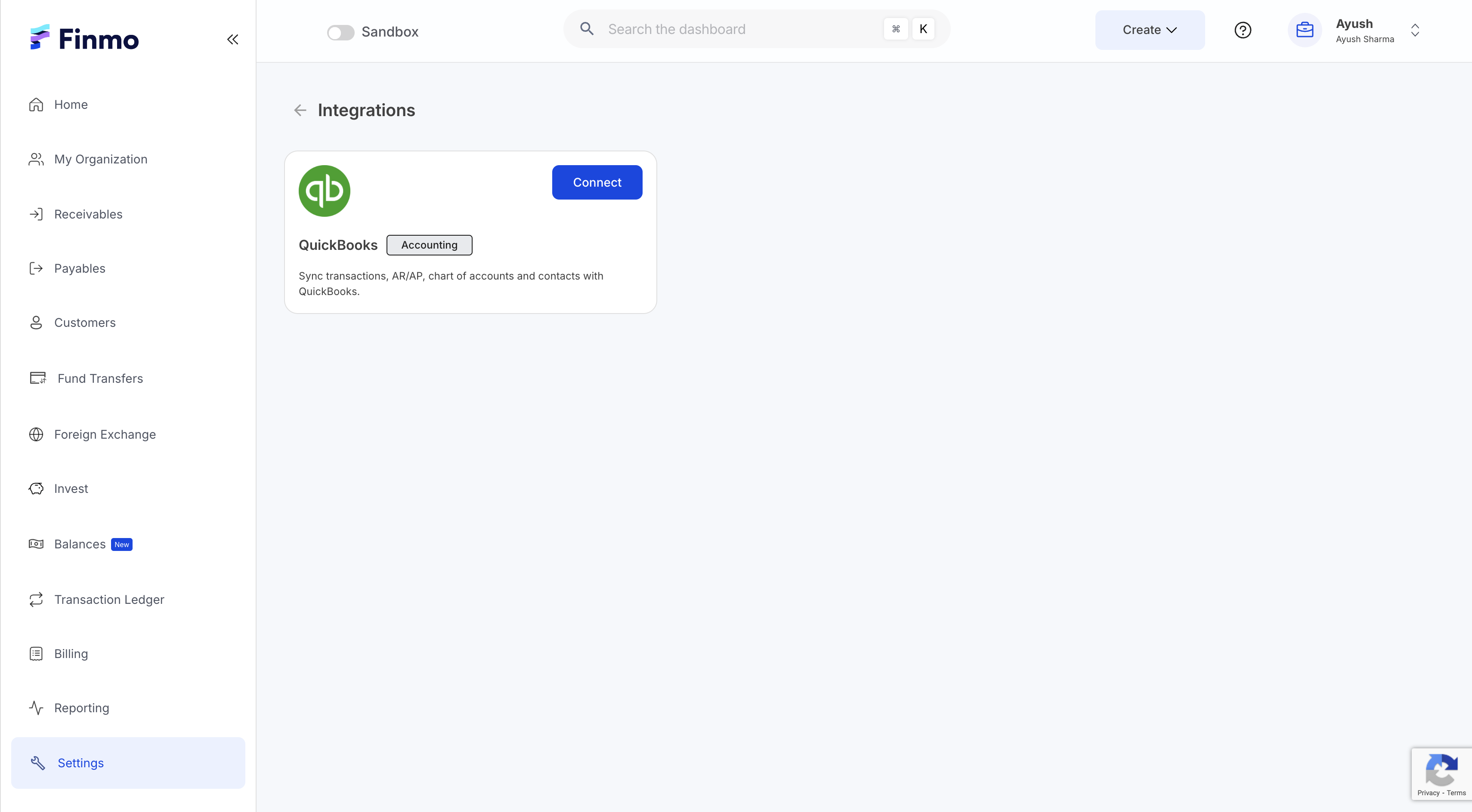 This section outlines the steps to connect your Quickbooks account with Finmo, enabling AR and AP synchronization between the two platforms.