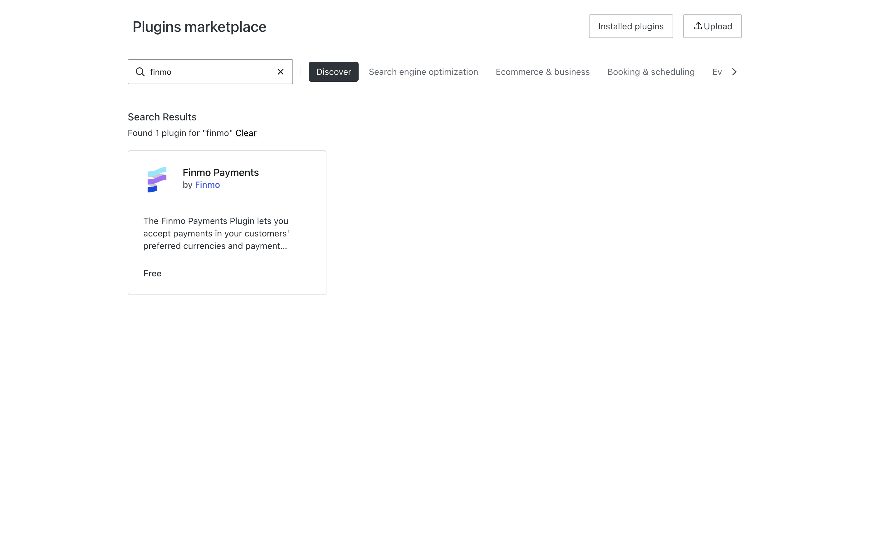 - You will be redirected to Wordpress's plugins market place. In the search bar, type “Finmo Payments”. You’ll see the Finmo Payments plugin appear in the results.