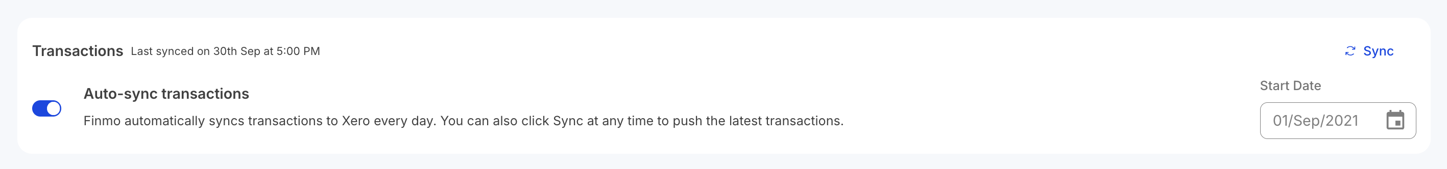 - Starting State: When syncing transactions for the first time, select the correct start date, which determines when Finmo will sync transactions to Xero. This action is irreversible, so ensure the date is accurate.