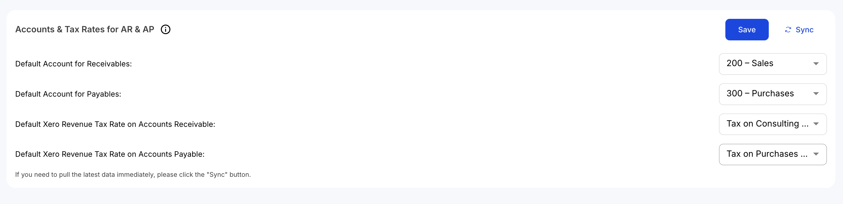 - The Chart of Accounts displayed are those imported from Xero. Click Sync to update any recent changes from Xero. After applying your configuration, it is important to save to ensure the changes take effect.