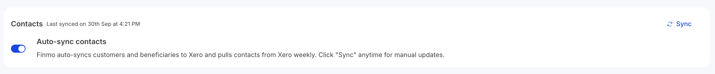 - Before pushing transactions to Xero, ensure that Customers and Beneficiaries from Finmo are synced to Xero. In Xero, Customers and Beneficiaries are referred to as Contacts.