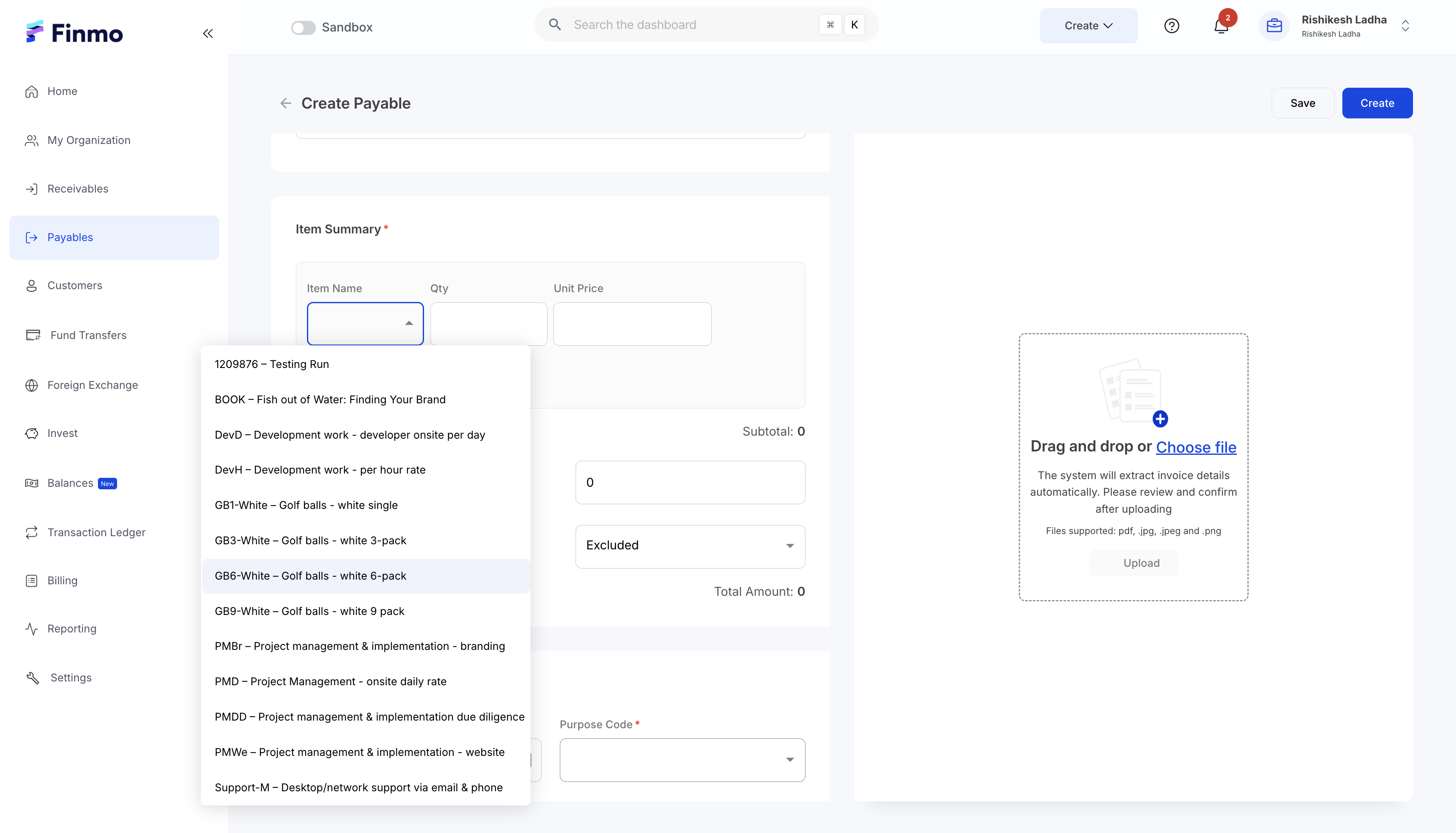 - When you select an item, the unit price will auto-populate if it has been defined in Finmo.