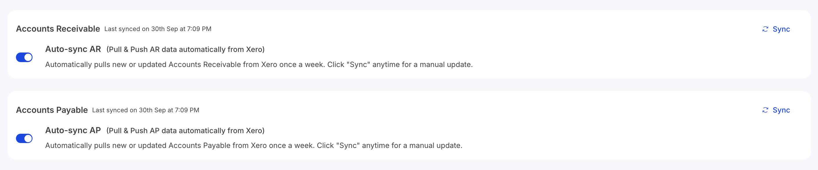 - In the Accounts Receivable and Accounts Payable cards, merchants can view the last sync timestamp for AR and AP.