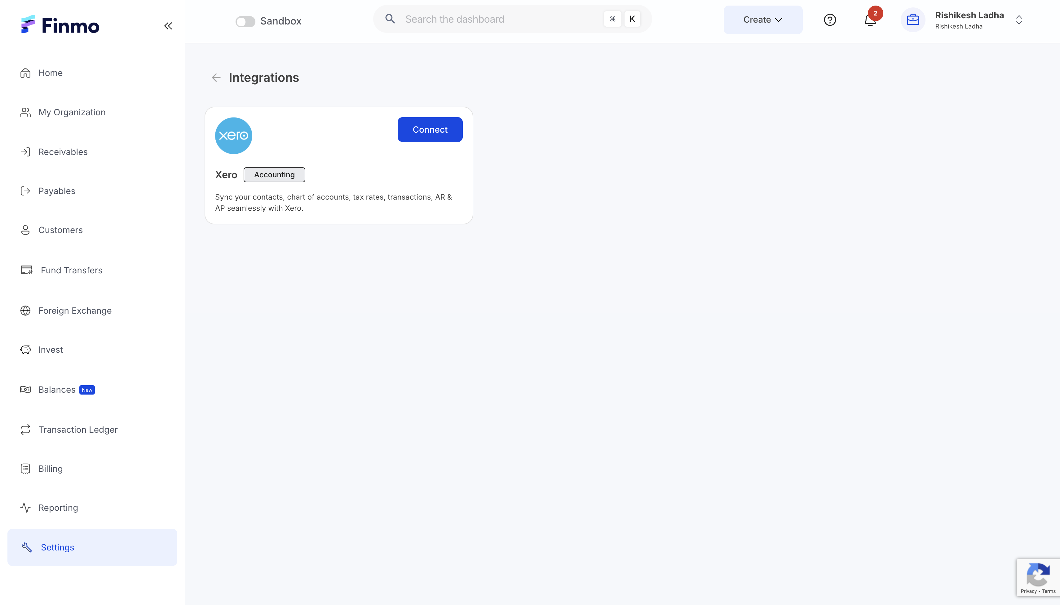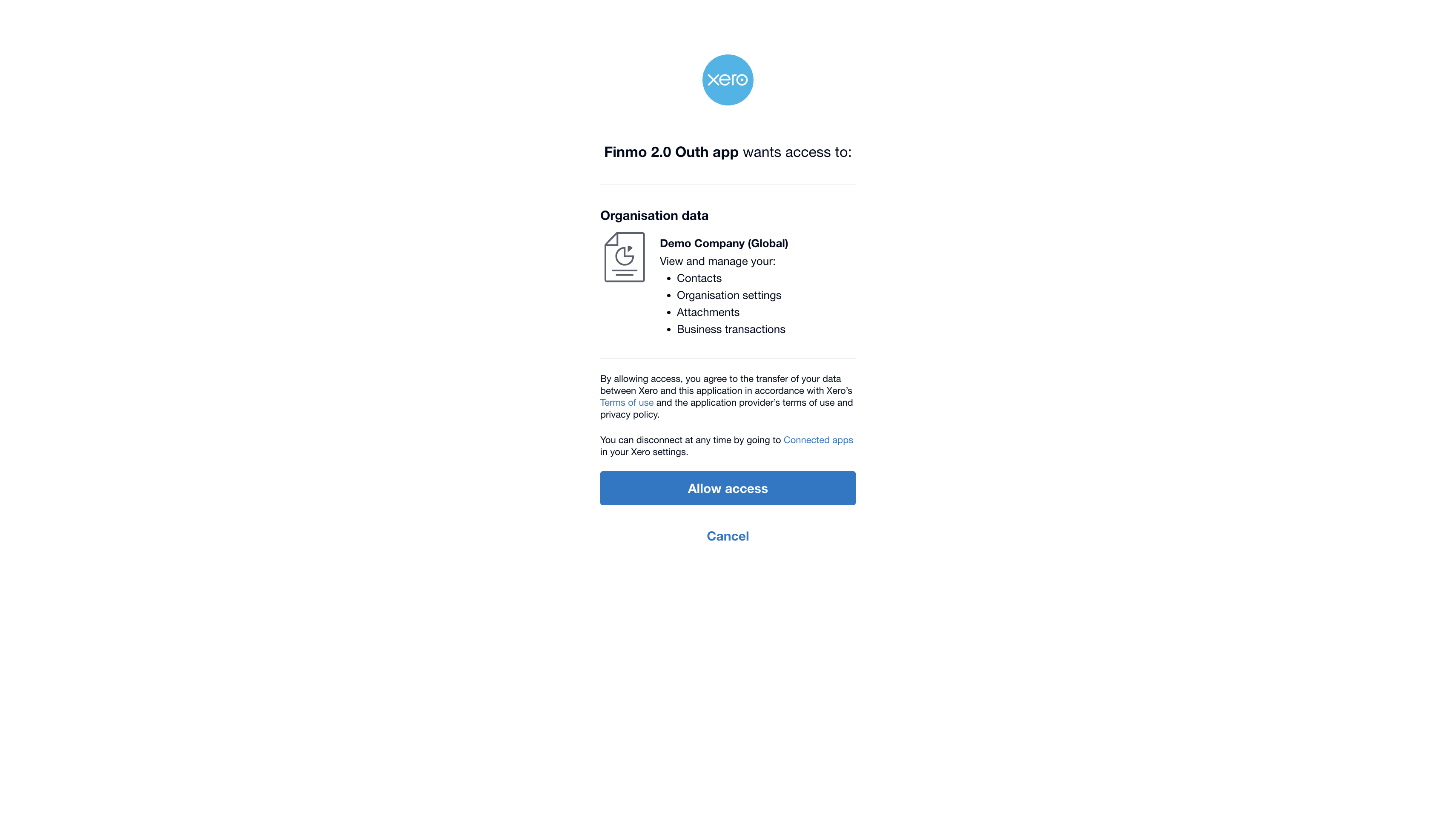 - Click Connect on the Xero card to be redirected to your Xero account for authorization. Once you grant access, a secure connection will be established between your Finmo and Xero accounts.
